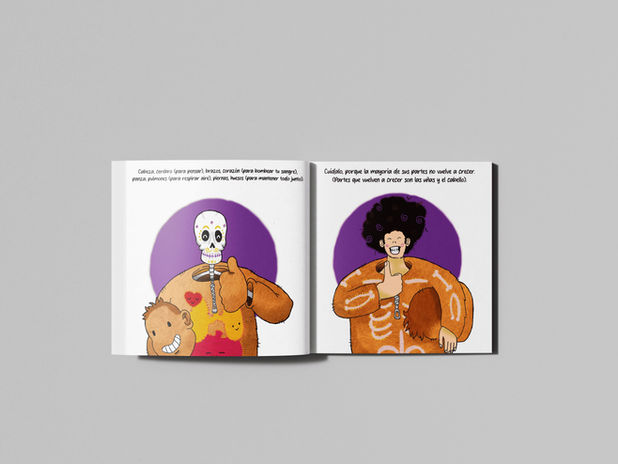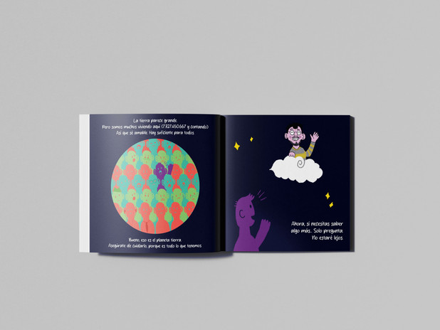 Proyecto de reinterpretación editorial del libro “Estamos aquí, Notas para vivir en el planeta Tierra" de Oliver Jeffers. Cada párrafo fue ilustrado con un estilo que recuerda a los libros infantiles, usando páginas enfrentadas que se relacionan entre sí para mantener la coherencia y el flujo narrativo del texto.